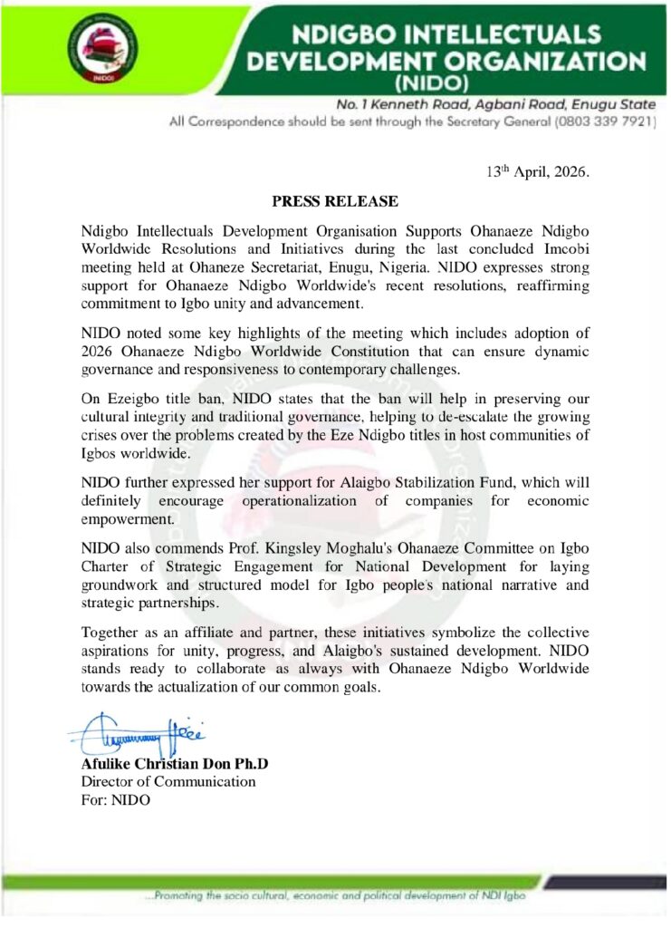 A Non-governmental sociocultural interest group Ndigbo Intellectuals Development Organization has thrown. their weight behind the apex Igbo cultural organization Ohaneze Ndigbo worldwide over the decision to ban Ezeigbo titles outside Igboland and in the diaspora.